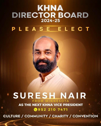 ഷിക്കാഗോ: കേരള ഹിന്ദൂസ് ഓഫ് നോര്ത്ത് അമേരിക്ക (KHNA) യുടെ 2024 – 25 ഭരണസമിതിയിലെ വൈസ് പ്രസിഡന്റ് സ്ഥാനത്തേക്ക് മിനസോട്ടയില് നിന്നുള്ള സുരേഷ് നായർ മത്സരിക്കുന്നു. നവംബർ 23, 24, 25 എന്നീ ദിവസങ്ങളിൽ ഹ്യൂസ്റ്റനിൽ വച്ച് നടക്കുന്ന ഹിന്ദു സമ്മേളനത്തിൽ (അശ്വമേധം) ആണ് അടുത്ത ഭരണസമിതിയിലെ ഭാരവാഹികളെ തിരഞ്ഞെടുക്കുന്നത്. കഴിഞ്ഞ ഒരു ദശകത്തിലേറെയായി KHNA യുടെ സജീവ പ്രവർത്തകനായ സുരേഷ് നായർ, സംഘടനയുടെ ജനറൽ സെക്രട്ടറിയായി ഇപ്പോൾ സേവനം ചെയ്യുന്നു. 2025 ൽ രജത ജൂബിലി ആഘോഷിക്കാൻ തയ്യാറെടുക്കുന്ന KHNA, നോർത്ത് അമേരിക്കയിലെ മലയാളി ഹിന്ദുക്കളുടെ ഏറ്റവും വലിയ സംഘടനയാണ്. അതോടൊപ്പം നോർത്ത് അമേരിക്കയിലെ ഏറ്റവും വലിയ മലയാളി സംഘടനയും കൂടിയാണ്.