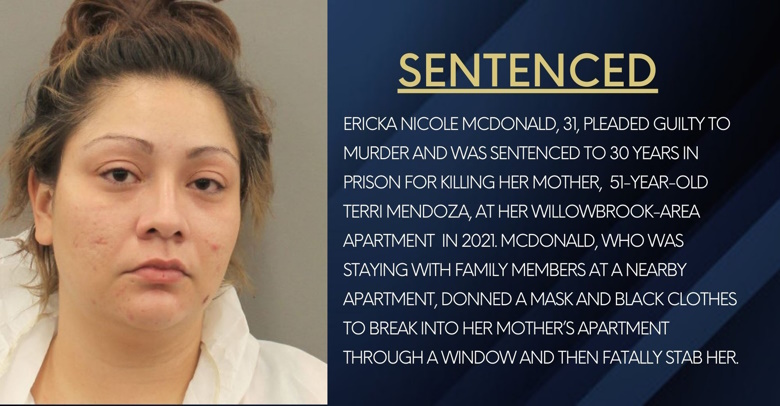 2021 ഓഗസ്റ്റിൽ, മുഖംമൂടിയും കറുത്ത വസ്ത്രവും ധരിച്ചിരുന്ന എറിക്ക നിക്കോൾ മക്ഡൊണാൾഡ് — അവളുടെ അമ്മയുടെ വില്ലോബ്രൂക്ക് ഏരിയയിലെ അപ്പാർട്ട്മെന്റിൽ ജനലിലൂടെ കടന്നുകയറി കുത്തിക്കൊലപ്പെടുത്തി. തുടർന്ന് അവൾ പോയി, വസ്ത്രം മാറി മിനിറ്റുകൾക്കുള്ളിൽ സംഭവസ്ഥലത്തേക്ക് മടങ്ങി, എന്താണ് സംഭവിച്ചതെന്ന് അറിയില്ലെന്ന് നടിച്ചു, ഹാരിസ് കൗണ്ടി ഡിസ്ട്രിക്റ്റ് അറ്റോർണി ഓഫീസ് പറഞ്ഞു.