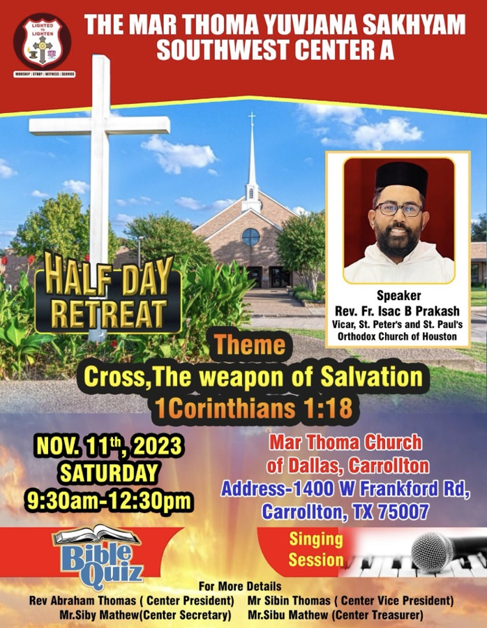 ഡാളസ്: നോർത്ത് അമേരിക്കാ യൂറോപ്പ് ഭദ്രാസന യുവജനസഖ്യം സൗത്ത് വെസ്റ്റ് “സെന്റർ എ” ഏകദിന പഠന സമ്മേളനം നവംബർ 11ന് ശനിയാഴ്ച നടത്തപ്പെടുന്നു. മാർത്തോമ ചർച്ച് ഓഫ് കരോൾട്ടൺ യുവജനസഖ്യം (1400 W Frankfort Rd, Carrollton, TX) സമ്മേളനത്തിന് ആതിഥേയത്വം വഹിക്കും. ഹ്യൂസ്റ്റൺ സെന്റ് പീറ്റേഴ്സ് ആൻഡ് സെന്റ് പോൾസ് ഓർത്തോഡോക്സ് ചർച്ച് വികാരി റവ. ഫാ. ഐസക് ബി പ്രകാശ് പഠന ക്ലാസുകൾക്ക് നേതൃത്വം നൽകും. “കുരിശ് രക്ഷയുടെ ആയുധം” (1 കൊരിന്ത്യർ 1:18) എന്ന ചിന്താവിഷയം ആകുന്നു പഠനത്തിനായി തെരഞ്ഞെടുത്തിരിക്കുന്നത് .