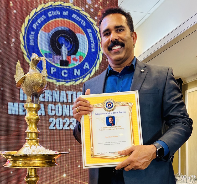 മയാമി: ഇന്ത്യ പ്രസ് ക്ലബ് ഓഫ് നോർത്ത് അമേരിക്ക ഈ വർഷത്തെ ബെസ്ററ് ക്യാമറാമാൻ അവാർഡ് നൽകി സെബാസ്റ്റ്യൻ സജി കുര്യനെ (സ്റ്റാർലൈൻ സജി) ആദരിച്ചു. 2023 നവംബർ 2, 3, 4 തീയതികളിലായി മയാമിയിലെ ഹോളിഡേ ഇൻ ഹോട്ടലിൽ വച്ച് നടത്തപ്പെട്ട പത്താമത് ഇന്ത്യ പ്രസ് ക്ലബ് കോൺഫറൻസിന്റെ പ്രൗഢഗംഭീരമായ അവാർഡ് ദാന ചടങ്ങിലാണ് പുതുപ്പള്ളി എംഎൽഎ ശ്രീ. ചാണ്ടി ഉമ്മൻ, അരൂർ എംഎൽഎ ശ്രീമതി ദലീമ ജോജോ എന്നിവർ ചേർന്ന് സജിക്ക് അവാർഡ് സമ്മാനിച്ചത്.