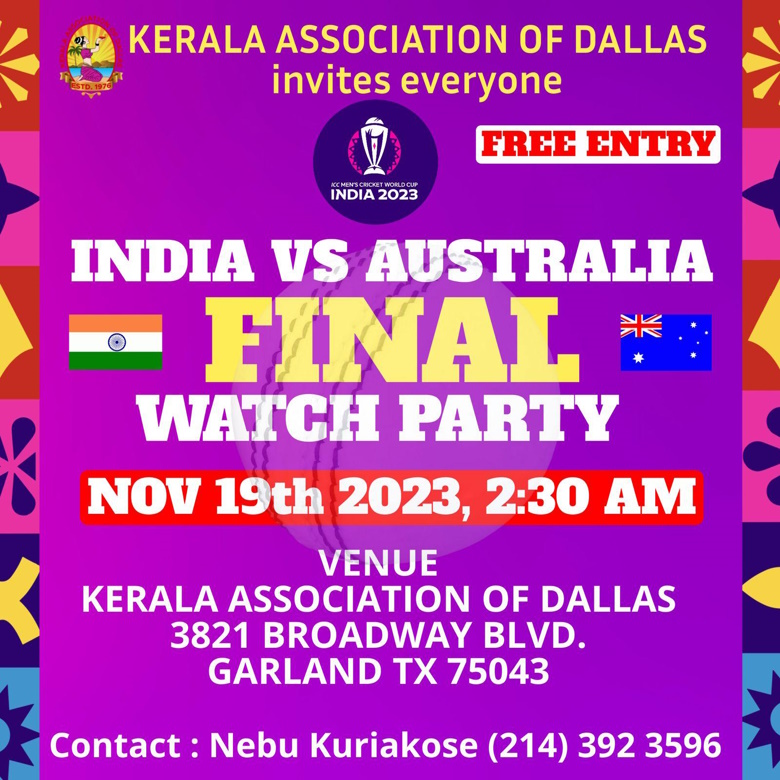 ഡാളസ്: ഞായറാഴ്ച രാവിലെ 2:30ന് ആരംഭിക്കുന്ന ലോകകപ്പ് ക്രിക്കറ്റ് മത്സരം തൽസമയം വീക്ഷിക്കുവാൻ ഉള്ള ക്രമീകരണങ്ങൾ കേരള അസോസിയേഷൻ ഓഫ് ഡാളസ് ചെയ്തുവരുന്നു (3821 Broadway Blvd, Garland, TX 75043). ഇന്ത്യയും ഓസ്ട്രേലിയയും ആകുന്നു ഫൈനൽ മത്സരത്തിൽ മാറ്റുരയ്ക്കുന്നത്. 150ഇൽ പരം ആളുകൾക്ക് ഒരുമിച്ച് ഇരുന്ന് മത്സരം ആസ്വദിക്കുവാനുള്ള ക്രമീകരണമാണ് കേരള അസോസിയേഷൻ ഓഫ് ഡാളസ് ചെയ്തിരിക്കുന്നത്.