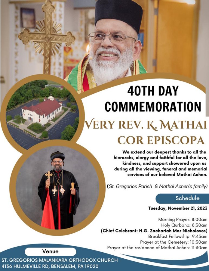 ഫിലഡൽഫിയ: മലങ്കര ഓർത്തഡോക്സ് സഭയുടെ അമേരിക്കൻ ഭദ്രാസനത്തിലെ ആദ്യകാല വൈദീകനും, ബെൻസേലം സെന്റ് ഗ്രീഗോറിയോസ് ഇടവകയുടെ സ്ഥാപക വികാരിയുമായിരുന്ന ഭാഗ്യ സ്മരണാർഹനായ വന്ദ്യ മത്തായി കോർ എപ്പീസ്ക്കോപ്പായുടെ 40-ാം ചരമദിനവും അനുസ്മരണ ശുശ്രൂഷയും നവംബർ 21 ചൊവ്വാഴ്ച അദ്ദേഹത്തിന്റെ മാതൃ ഇടവകയായ ബെൻസേലം സെന്റ് ഗ്രീഗോറിയോസ് ഓർത്തഡോക്സ് ചർച്ചിൽ വച്ച് നടത്തപ്പെടും. (St. Gregorios Malankara Orthodox Church, 4136 Hulmeville Rd, Bensalem, PA 19020).