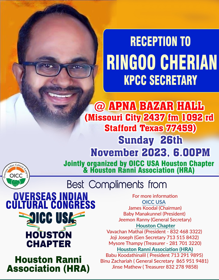 ഹൂസ്റ്റൺ: അമേരിക്കയിൽ ഹൃസ്വസന്ദര്ശനാര്ഥം എത്തിയ കെപിസിസി സെക്രട്ടറി റിങ്കൂ ചെറിയാന് ഹൂസ്റ്റണിൽ ഊഷ്മള സ്വീകരണം നൽകും.ഓവർസീസ് ഇന്ത്യൻ കൾച്ചറൽ കോൺഗ്രസ് യൂഎസ്എ (ഒഐസിസി യുഎസ്എ ) യുടെയും ഹൂസ്റ്റൺ റാന്നി അസോസിയേഷന്റെയും (HRA) ആഭിമുഖ്യത്തിലാണ് സ്വീകരണ സമ്മേളനം സംഘടിപ്പിച്ചിരിക്കുന്നത്. നവംബര് 26 നു ഞായറാഴ്ച വൈകുന്നേരം 6 ന് സ്റ്റാഫോർഡിലെ അപ്നാ ബസാർ ഹാളിലാണ് സമ്മേളനം സംഘടിപ്പിച്ചിരിക്കുന്നത്. (2437 FM 1092 Rd, Stafford, TX 77459)