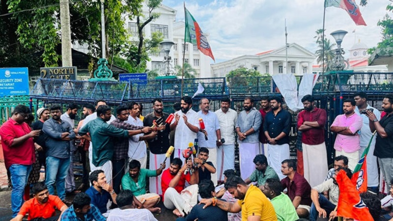 വ്യാജ വോട്ടർ തിരിച്ചറിയൽ കാർഡ്: യൂത്ത് കോൺഗ്രസ് നേതാക്കളെ അറസ്റ്റ് ചെയ്യണമെന്നാവശ്യപ്പെട്ട് യുവമോർച്ചയുടെ പ്രതിഷേധം