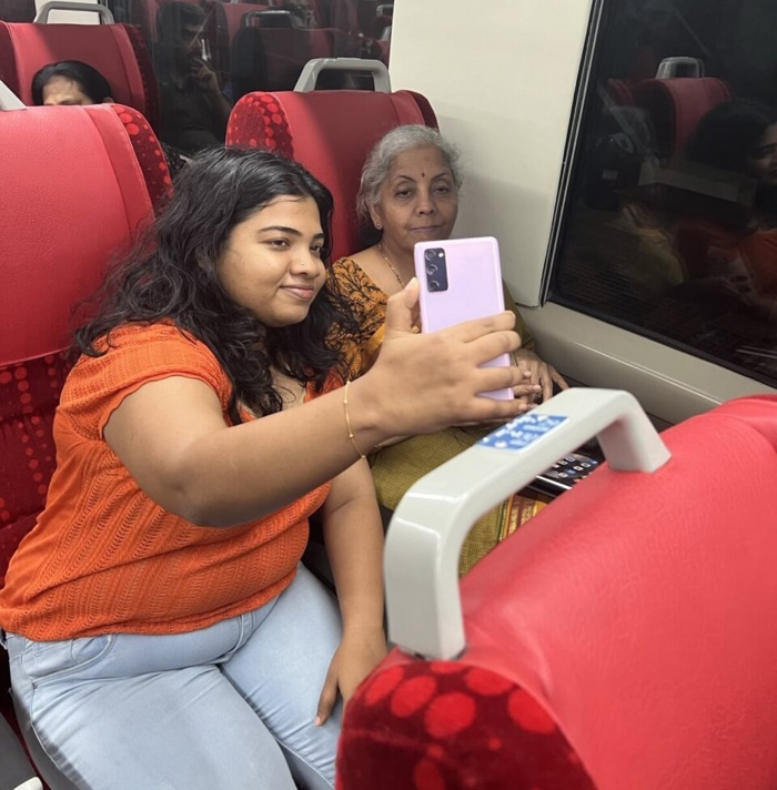 വന്ദേ ഭാരത് ട്രെയിനിൽ യാത്ര ചെയ്തതിന്റെ ചിത്രങ്ങൾ മന്ത്രി നിർമ്മല സീതാരാമൻ തന്നെയാണ് തന്റെ ഔദ്യോഗിക