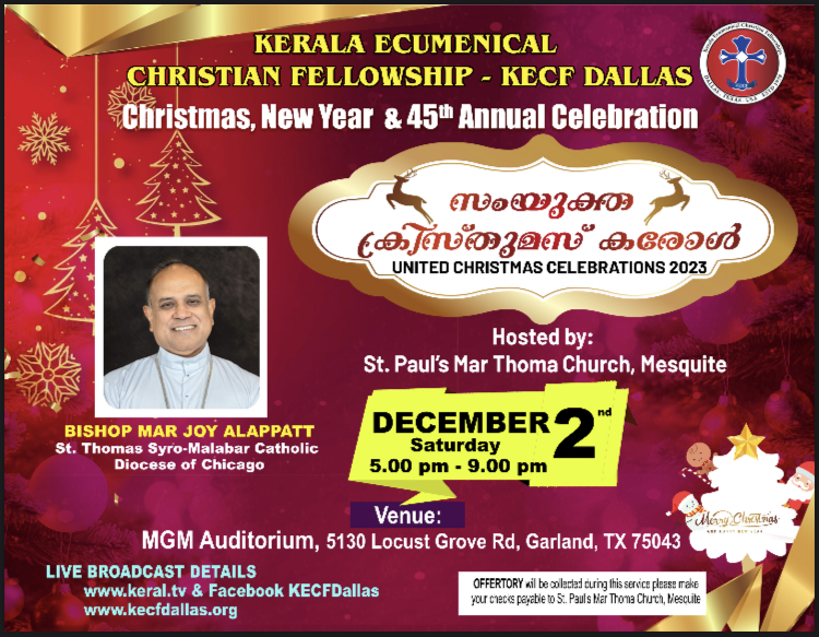 ഡാളസ്: സെൻറ് പോൾസ് മാർത്തോമാ ചർച്ച് ഡാളസ് ആതിഥേയത്വം വഹിക്കുന്ന കേരള എക്യൂമെനിക്കൽ ക്രിസ്ത്യൻ ഫെലോഷിപ്പ് സംയുക്ത ക്രിസ്മസ് പുതുവത്സര ആഘോഷങ്ങൾക്ക് ബിഷപ്പ് മാർ ജോയ് ആലപ്പാട്ട് ( സെൻറ് തോമസ് സീറോ മലബാർ കാത്തോലിക് ഡയോസിസ് ഓഫ് ഷിക്കാഗോ) മുഖ്യ അതിഥി ആയിരിക്കും. നാല്പത്തിഅഞ്ചാമത് സംയുക്ത ക്രിസ്മസ് പുതുവത്സര ആഘോഷങ്ങൾ ഡാളസ് സെൻറ് ഗ്രിഗോറിയോസ് ഓർത്തഡോക്സ് ചർച്ച് ഓഡിറ്റോറിയത്തിൽ വെച്ച് (5130 Locust Grove Rd, Garland , TX) ഡിസംബർ 2ന് ശനിയാഴ്ച വൈകിട്ട് 5 മണിക്ക് ആരംഭിക്കും.