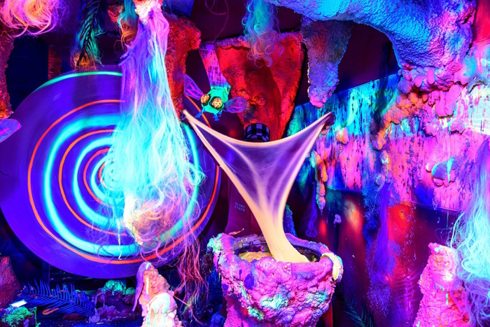 ഉയർന്ന സ്പർശനബോധം അനുഭവിക്കാൻ കണ്ണടച്ചിരിക്കുമ്പോൾ സന്ദർശകർക്ക് പരസ്പരം നയിക്കാനുള്ള ഒരു സെൻസറി ടച്ച് മതിൽ.കൈനറ്റിക് സാൻഡ് ഡൂൺസ് — ഫ്ലേവർ പേപ്പറുമായി സഹകരിച്ച് നിർമ്മിച്ച ഇഷ്ടാനുസൃത തിളങ്ങുന്ന വാൾപേപ്പറുള്ള ഒരു ബ്ലാക്ക് ലൈറ്റ് റൂമിൽ സാൻഡ്ബോക്സ് (എല്ലാം കൈനറ്റിക് സാൻഡ് പര്യവേക്ഷണത്തിന്) പുനർനിർമ്മിക്കുന്നതിന് രസകരമായ ഹൗസ്-സ്റ്റൈൽ വളഞ്ഞ മിററുകളുടെ ടവറുകളുള്ള അമോർഫിക് പട്ടികകൾ.പ്ലാനറ്റ് സ്ലൂ — ഒരു 360-ഡിഗ്രി CGI വീഡിയോ റൂം, അത് ആഴത്തിലുള്ള അനുഭവത്തിനായി വിവിധ ലോക ചിത്രങ്ങൾ ക്യൂറേറ്റ് ചെയ്യുന്നു.