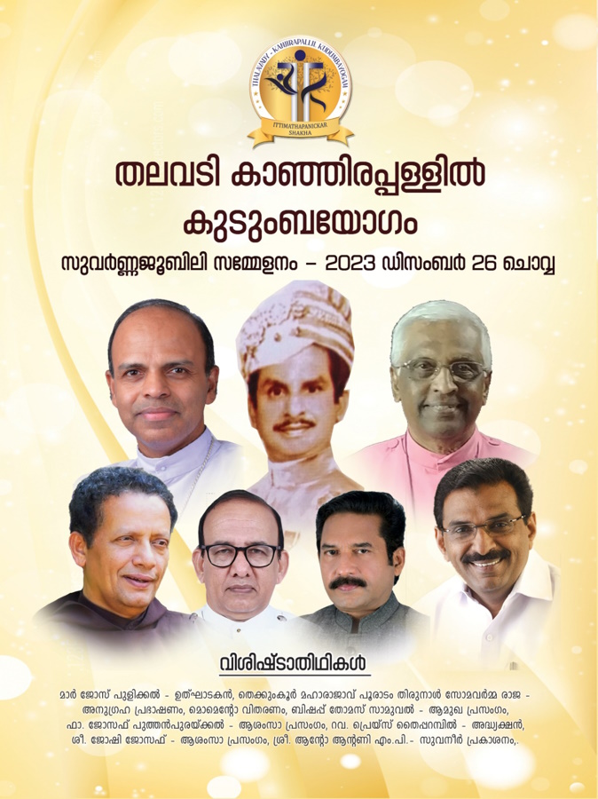 എടത്വ: തലവടി കാഞ്ഞിരപ്പള്ളിൽ(ഇ ട്ടിമാത്തപണിക്കർ ശാഖ)കുടുംബയോഗം സുവർണ്ണ ജൂബിലി സമ്മേളനം ഡിസംബർ 26ന് എം.ഡി.ജോസഫ് മണ്ണിപറമ്പിൽ നഗറിൽ (റോട്ടറി ക്ലബ് ഓഡിറ്റോറിയം, കാഞ്ഞിരപള്ളി ) നടക്കും.രാവിലെ 9ന് വാർഷിക യോഗം നടക്കും. തുടർന്ന് 11 മണിക്ക് നടക്കുന്ന പൊതുസമ്മേളനം കാഞ്ഞിരപ്പള്ളി രൂപത ബിഷപ്പ് മാർ ജോസ് പുളിക്കൽ ഉദ്ഘാടനം ചെയ്യും. റവ.പ്രെയിസ് തൈപറമ്പിൽ അധ്യക്ഷത വഹിക്കും. തെക്കുംകൂർ മഹാരാജാവ് രാജശ്രീ പൂരാടം തിരുന്നാൾ സോമവർമ്മ രാജ അനുഗ്രഹ പ്രഭാഷണവും പുരസ്ക്കാര വിതരണവും നിർവഹിക്കും.കുടുംബയോഗം രക്ഷാധികാരി ബിഷപ്പ് തോമസ് സാമുവേൽ വാലയിൽ ആമുഖ സന്ദേശം നല്കും.ആൻ്റോ ആൻ്റണി എം.പി സുവർണ്ണ ജൂബിലി സ്മരണിക പ്രകാശനം ചെയ്യും.ഫാദർ ജോസഫ് പുത്തൻപുരയ്ക്കൽ, ജോഷി ജോസഫ് മണ്ണിപറമ്പിൽ എന്നിവർ ആശംസസന്ദേശം നല്കും.