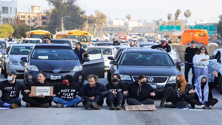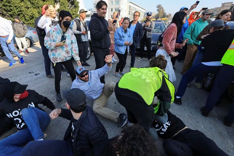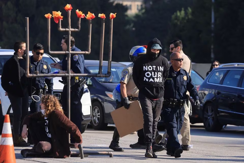‘ഇഫ് നോട്ട് നൗ’ എന്ന സംഘടനയിൽ നിന്നുള്ള പ്രതിഷേധക്കാർ രാവിലെ 9 മണിയോടെ 110 ഫ്രീവേ ഡൗണ്ടൗണിന്റെ തെക്കോട്ടുള്ള റോഡ് ഉപരോധിച്ചാണ് യാത്രക്കാരെ തടഞ്ഞത്. പ്രതിഷേധക്കാർ കറുത്ത ഷർട്ട് ധരിച്ച് ‘നോട്ട് ഇൻ ഔർ നെയിം’ എന്നെഴുതിയ പ്ലക്കാർഡുകൾ ഉയർത്തി ഗാസയിലെ സൈനിക പ്രവർത്തനങ്ങൾ ഇസ്രായേൽ നിർത്തണമെന്ന് ആവശ്യപ്പെട്ടു.