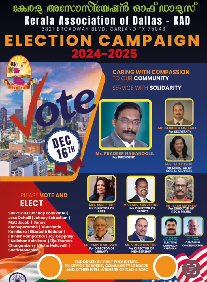 ഡാളസ്: കേരള അസോസിയേഷൻ ഓഫ് ഡാളസിന്റെ 2024-25 വർഷത്തേക്കുള്ള തിരഞ്ഞെടുപ്പ് ഈ വരുന്ന 16-ാം തീയതി നടക്കുകയാണ്. ഞാനും എന്റെ പാനലിലുള്ള എല്ലാവരും ഇതിനോടകം തന്നെ നിങ്ങളുമായി, ഒരുപക്ഷേ പല തവണ ബന്ധപ്പെട്ട് വോട്ടുകൾ അഭ്യർത്ഥിച്ചിട്ടുള്ളതാണല്ലോ? ഞങ്ങളുടെ കഴിവിന്റെ പരമാവധി നിങ്ങളെ എല്ലാവരെയും നേരിൽ കണ്ട് വോട്ടുകൾ അഭ്യർത്ഥിക്കാൻ ശ്രമിച്ചിട്ടുള്ളതുമാണ്. എന്നിരുന്നാലും, സമയ പരിധി മൂലം അത് യാഥാർഥ്യമാകുമോ എന്ന ആശങ്കയിലാണ് ഈ അഭ്യര്ത്ഥന നിങ്ങളുടെ മുമ്പിൽ സമർപ്പിക്കുന്നത്!