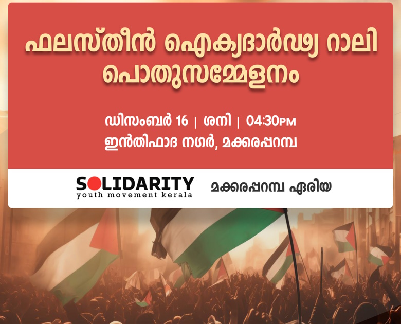 മക്കരപ്പറമ്പ : സോളിഡാരിറ്റി യൂത്ത് മൂവ്മെന്റ് മക്കരപ്പറമ്പ ഏരിയ സംഘടിപ്പിക്കുന്ന ഫലസ്തീൻ ഐക്യദാർഢ്യ റാലിയും പൊതുസമ്മേളനവും ഡിസംബർ 16ന് ശനിയാഴ്ച വൈകീട്ട് 05 മണിക്ക് മക്കരപ്പറമ്പിൽ നടക്കും. പരിപാടിയുടെ വിജയത്തിനായി സ്വാഗത സംഘം രൂപീകരിച്ചു.