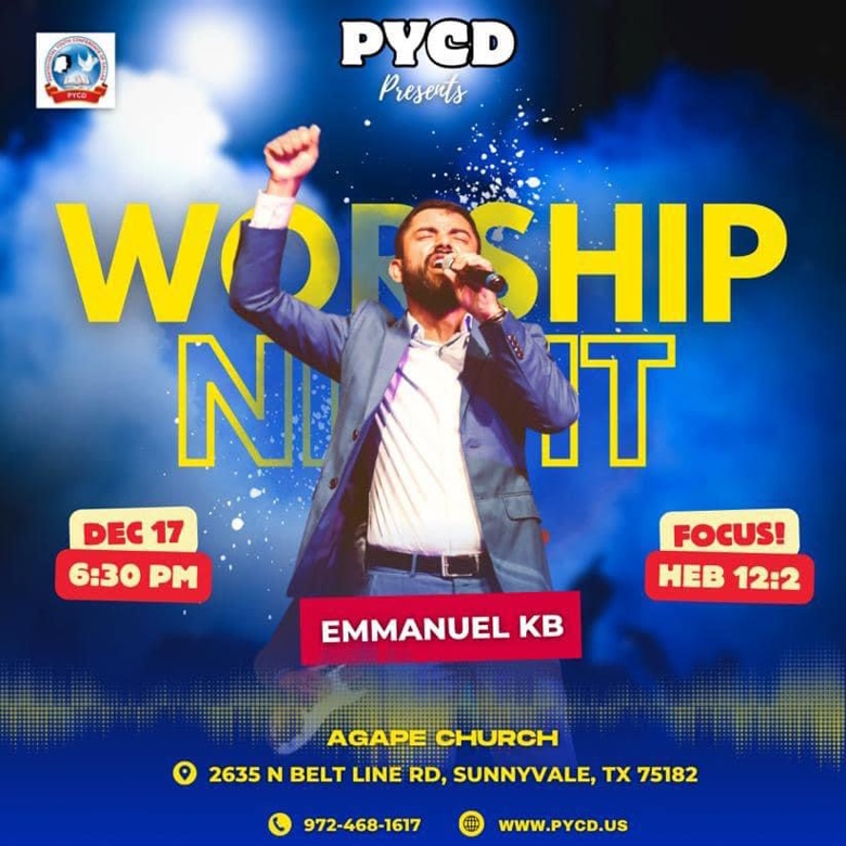 ഡാളസ്: പെന്തക്കോസ്തൽ യൂത്ത് കോൺഫറൻസ് ഓഫ് ഡാളസി(പി.വൈ.സി.ഡി)ന്റെ നേതൃത്വത്തിൽ സണ്ണിവെയ്ലിലുള്ള അഗാപ്പെ ചർച്ചിൽ വച്ച് നടക്കുന്ന വർഷിപ്പ് നൈറ്റിൽ പ്രശസ്ത വർഷിപ്പ് ലീഡർ ഇമ്മാനുവൽ കെ ബി ഗാനശുശ്രൂഷയോടൊപ്പം അനുഭങ്ങളും പങ്കുവയ്ക്കുന്നു. ഡിസംബർ 17 ഞായറാഴ്ച 6:30-ന് നടക്കുന്ന യോഗത്തിൽ ആത്മീയ സംഗീത രംഗത്തെ പ്രതിഭകളും അണിനിരക്കുന്നു.