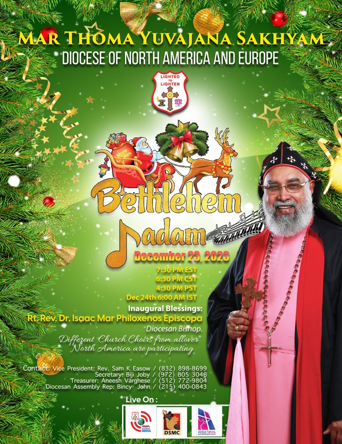 ഡാളസ്: നോർത്ത് അമേരിക്ക യൂറോപ്പ് ഭദ്രാസന യുവജനസഖ്യത്തിന്റെ ആഭിമുഖ്യത്തിൽ ക്രിസ്തുമസ് ഗാനശുശ്രൂഷ “ബേത്ലഹേം നാദം” ഡിസംബർ 23 ശനിയാഴ്ച വൈകിട്ട് 7:30 മണിക്ക് നടത്തപ്പെടുന്നു. ഭദ്രാസന അധിപൻ റൈറ്റ്. റവ.ഡോ. ഐസക് മാർ ഫിലക്സിനോസ് എപ്പിസ്കോപ്പാ ക്രിസ്തുമസ് സന്ദേശം നൽകും. ഭദ്രാസനത്തിൽ ഉള്ള വിവിധ ശാഖകളിലെ യുവജനസഖ്യത്തിന്റെ ഗായകസംഘങ്ങൾ ഗാനങ്ങൾ ആലപിക്കും.