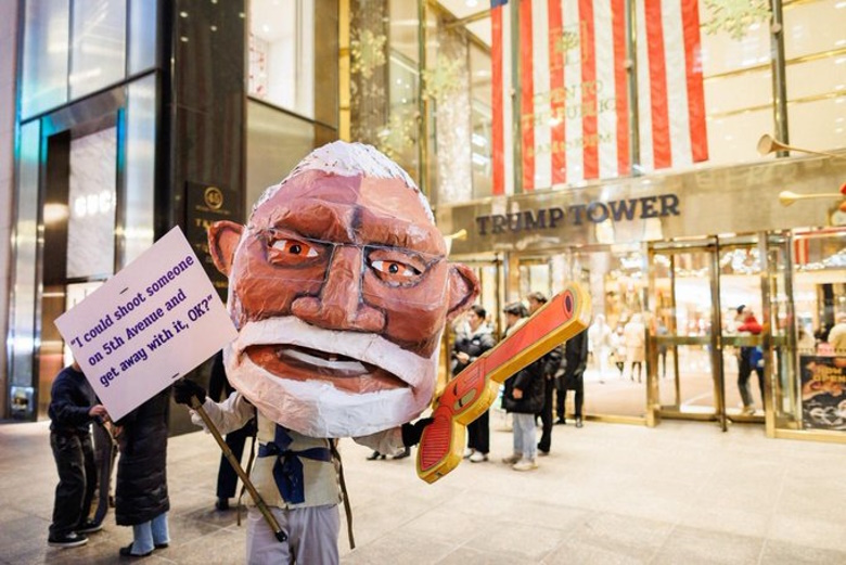 ഫിഫ്ത്ത് അവന്യൂവിലൂടെ, ഇന്ത്യൻ പ്രധാനമന്ത്രി നരേന്ദ്ര മോദിയുമായി സാമ്യമുള്ള ഒരു ഭീമാകാരമായ പാവ ഒരു കൺവേർട്ടിബിളിൽ കയറി, “എനിക്ക് ഫിഫ്ത്ത് അവന്യൂവിൽ ഒരാളെ വെടിവെച്ച് രക്ഷപ്പെടാം, ശരി?”