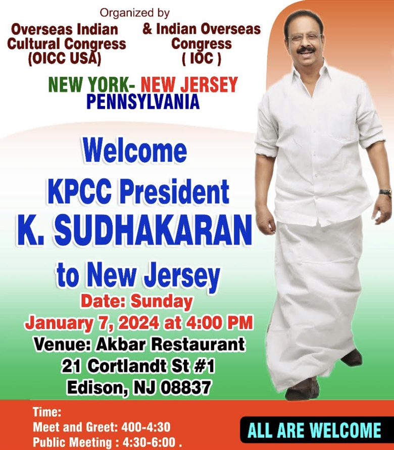 ന്യൂജേഴ്സി – ഹ്രസ്വ സന്ദർശനത്തിനായി അമേരിക്കയിൽ എത്തിച്ചേർന്ന കേരള പ്രദേശ് കോൺഗ്രസ് കമ്മിറ്റിയുടെ അധ്യക്ഷൻ കെ സുധാകരൻ ഇന്ത്യൻ കൾച്ചറൽ ഓവർസീസ് കോൺഗ്രസ് ( ഓ ഐ സി സിയുഎസ് എ ) ന്റെയും, ഇന്ത്യൻ ഓവർസീസ് കോൺഗ്രസ് ( ഐ ഓ സി യുഎസ്എ) യുടെയും സംയുക്താഭിമുഖ്യത്തിൽ ജനുവരി ഏഴാം തീയതി ഞായറാഴ്ച വൈകുന്നേരം 4 മണിക്ക് ന്യൂജേഴ്സി എഡിസൺ അക്ബർ ഹോട്ടലിൽ വച്ച് ഉജ്ജ്വല സ്വീകരണം നൽകുന്നത്തിനുള്ള ഒരുക്കങ്ങൾ ആരംഭിച്ചു.