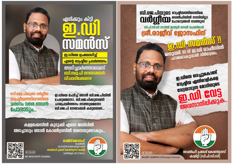 “ഡെൽഹി പ്രദേശ് കോൺഗ്രസ് കമ്മിറ്റി – സൗത്ത് ഇന്ത്യൻ സെല്ലിന്റെ സംസ്ഥാന ചെയർമാൻ എന്ന നിലയിൽ, ഡെൽഹിയിലെ കോടീശ്വരന്മാരായ ബിജെപി നേതാക്കൾക്കെതിരെ താൻ രാഷ്ട്രീയ പ്രവർത്തനം നടത്തുന്നത്, പൊതുപ്രവർത്തന രംഗത്ത് കഴിഞ്ഞ 45 വർഷങ്ങൾക്കൊണ്ട് താനുണ്ടാക്കിയ അനുഭവ സമ്പത്തുകൊണ്ടാണ്. അല്ലാതെ ഇ.ഡി ഉദ്ദേശിക്കുന്നതുപോലെ പണക്കൊഴുപ്പുകൊണ്ടല്ലെന്ന്”, രാജീവ് ജോസഫ് വ്യക്തമാക്കി.