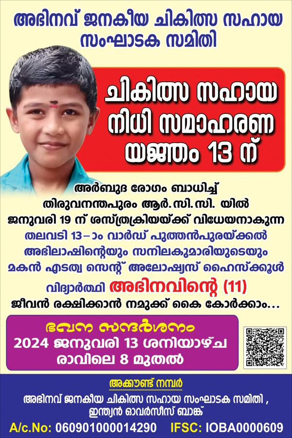 എടത്വ: തലവടി പഞ്ചായത്ത് 13-ാം വാർഡിൽ കോടമ്പനാടി പുത്തൻപുരയ്ക്കൽ വീട്ടിൽ അഭിലാഷിൻ്റെയും സനില കുമാരിയുടെയും മൂത്ത മകൻ അഭിനവ് (11) അർബുദ രോഗം ബാധിച്ച് തിരുവനന്തപുരം റീജിയണൽ ക്യാൻസർ സെൻ്ററിൽ ചികിത്സയിലാണ്.ജനുവരി 19ന് മജ്ജ മാറ്റി വെയ്ക്കൽ ശസ്ത്രക്രിയയ്ക്ക് വിധേയനാകുകയാണ്.അതിന് മുന്നോടിയായി ഉളള പരിശോധനകൾ നടന്നു കൊണ്ടിരിക്കുന്നു.