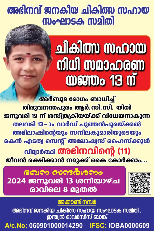 എടത്വ: അർബുദ രോഗം ബാധിച്ച് തിരുവനന്തപുരം റീജിയണൽ ക്യാൻസർ സെൻ്ററിൽ ശസ്ത്രക്രിയയ്ക്ക് വിധേയനാകുന്ന തലവടി ഗ്രാമപഞ്ചായത്ത് 13-ാം വാർഡിൽ കോടമ്പനാടി പുത്തൻപുരയ്ക്കൽ വീട്ടിൽ അഭിലാഷിൻ്റെയും സനിലകുമാരിയുടെയും മൂത്ത മകൻ അഭിനവിനുള്ള (11) ചികിത്സ സഹായ സമാഹരണം ഇന്ന് നടക്കും.എടത്വ സെന്റ് അലോഷ്യസ് കോളജ് എൻഎസ്എസ് പ്രവർത്തകർ സമാഹരിച്ച അമ്പതിനായിരം രൂപ കോളജ് ഓഫിസിൽ നടന്ന ചടങ്ങിൽ പ്രിൻസിപ്പാൾ പ്രൊഫ. ഡോ. ജി. ഇന്ദുലാൻ, എൻ. എസ്. എസ് പ്രോഗ്രാം ഓഫിസർമാരായ മനോജ് സേവ്യർ,വി. ആർ ഇന്ദു, എൻ. എസ്. എസ് വോളണ്ടിയർ കെ.ജെ ആൽബിൻ എന്നിവരിൽ നിന്നും സമിതി ഭാരവാഹികൾ ഏറ്റ് വാങ്ങി. ചടങ്ങിൽ ഗ്രാമ പഞ്ചായത്ത് അംഗം ബിജു ജോർജ് അധ്യക്ഷത വഹിച്ചു.