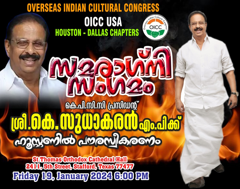 ഹൂസ്റ്റൺ : ഹൃസ്വ സന്ദർശനാർത്ഥം അമേരിക്കയിൽ എത്തിയിട്ടുള്ള ഇന്ത്യൻ നാഷണൽ കോൺഗ്രസിന്റെ കരുത്തനായ നേതാവും കേരളാ പ്രദേശ് കോൺഗ്രസ് കമ്മിറ്റിയുടെ (കെപിസിസി) പ്രസിഡന്റുമായ കെ.സുധാകരൻ എംപിക്ക് ഓവർസീസ് ഇന്ത്യൻ കൾച്ചറൽ കോൺഗ്രസ് (ഒഐസിസി യുഎസ്എ ) ഹൂസ്റ്റൺ – ഡാളസ് ചാപ്റ്ററുകളുടെ നേതൃത്വത്തില് ഹ്യൂസ്റ്റണിൽ ഉജ്ജ്വല വരവേൽപ്പ് നൽകുന്നു.