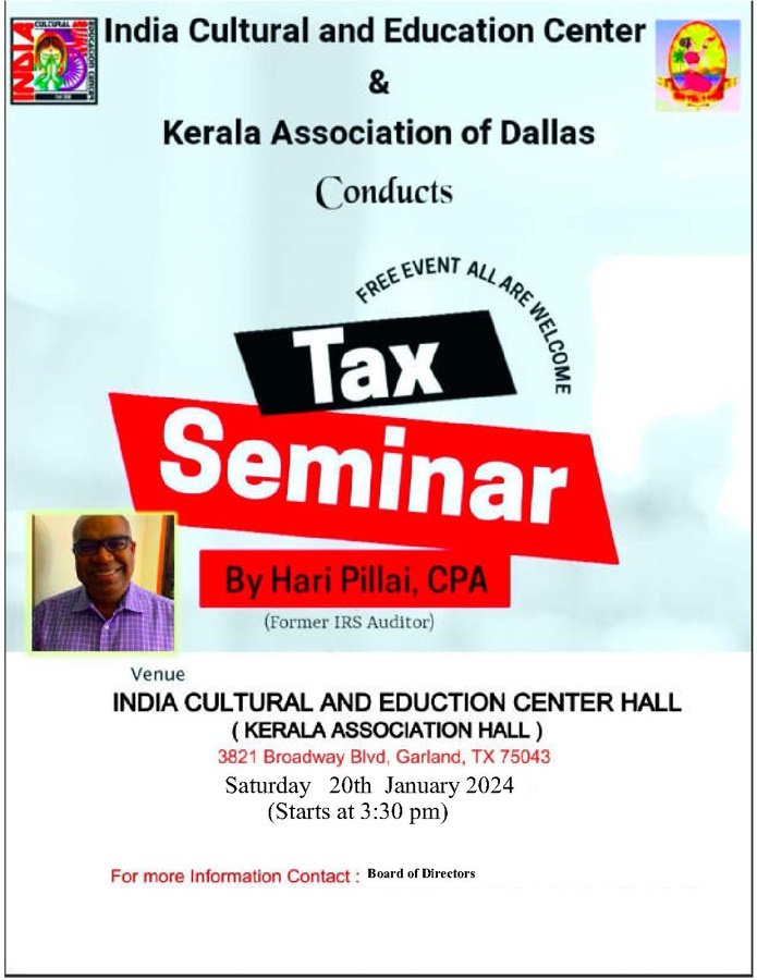 ഡാളസ് :കേരള അസോസിയേഷൻ ഓഫ് ഡാളസും ഇന്ത്യ കൾച്ചറൽ ആൻഡ് എജുക്കേഷൻ സെൻററും സംയുക്തമായി 2024 ജനുവരി 20 ശനിയാഴ്ച വൈകീട്ട് 3 30 ന് ടാക്സ് സെമിനാർ സംഘടിപ്പിക്കുന്നു