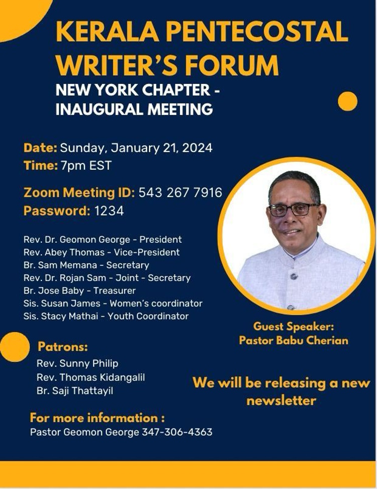 ന്യൂയോർക്ക് : നോർത്ത് അമേരിക്കൻ പെന്തക്കോസ്തൽ റൈറ്റേഴ്സ് ഫോറം ന്യൂയോർക്ക് ചാപ്റ്റർ പ്രവർത്തനോഘ്ടനം ജനുവരി 21-ന് ഞായറാഴ്ച വൈകീട്ട് ഏഴിന് സൂം പ്ലാറ്റ്ഫോമിൽ വെച്ച് നടത്തപ്പെടും. ചാപ്റ്റർ പ്രസിഡന്റ് റവ.ഡോ.ജോമോൻ ജോർജ് അധ്യക്ഷത വഹിക്കുന്ന യോഗത്തിൽ അനുഗ്രഹീത ആത്മീയ പ്രഭാഷകൻ പാസ്റ്റർ ബാബു ചെറിയാൻ മുഖ്യ സന്ദേശം നൽകും.