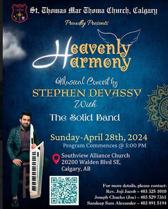 കാൽഗറി : കാൽഗറി സെന്റ് തോമസ് മാർ തോമസ് പള്ളിയുടെ ധനസമാഹരണത്തിന്റെ ഭാഗമായി പ്രശസ്ത സംഗീതജ്ഞൻ സ്റ്റീഫൻ ദേവസ്സിയും സോളിഡ് ബാൻഡും ചേർന്ന് അവതരിപ്പിക്കുന്ന “ഹെവൻലി ഹാർമണി” എന്ന സംഗീത പരിപാടി കാൽഗറിയിൽ. 2024 ഏപ്രിൽ 28 ഞായറാഴ്ച southeast കാൽഗറിയിലെ സൗതവ്യൂ അലയൻസ് ചർച്ച് ഹാളിൽ വെച്ച് സംഗീതവിരുന്നു നടത്തപ്പെടും.