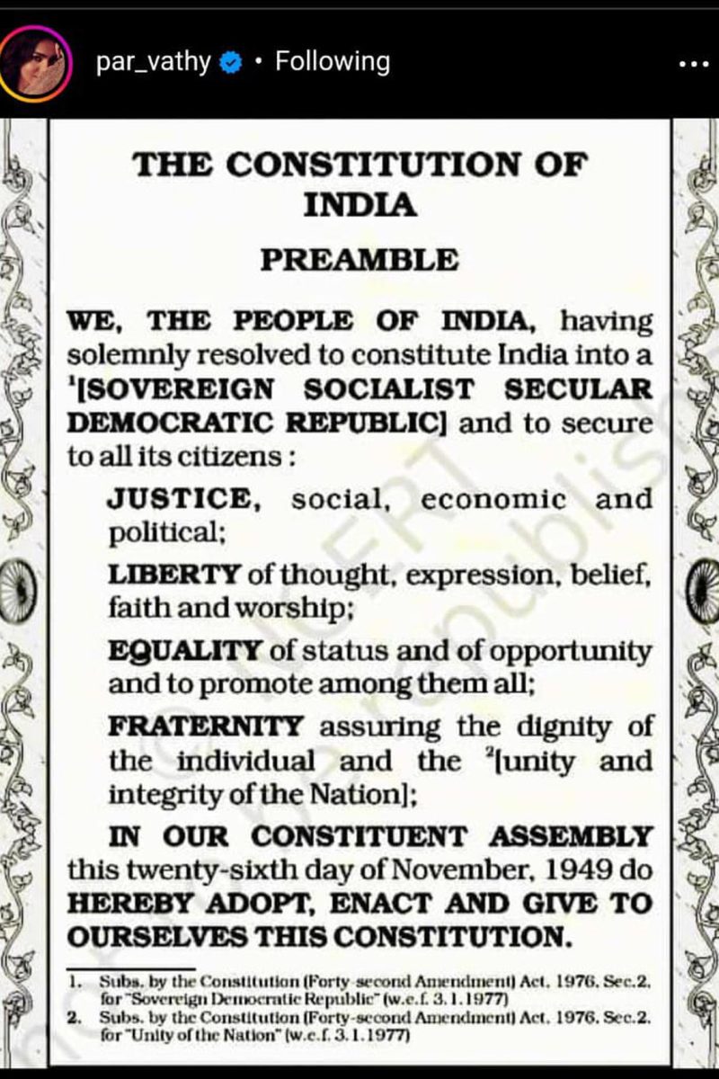 പോസ്റ്റുകൾ മണിക്കൂറുകൾക്കുള്ളിൽ പതിനായിരക്കണക്കിന് ആളുകൾ ലൈക്ക് ചെയ്യുകയും പങ്കിടുകയും ചെയ്തു, അതേസമയം ചില തീവ്രമായ കമന്റുകളും എഴുതി. ഉദാഹരണത്തിന്, ഒരു ഇൻസ്റ്റാഗ്രാം ഉപയോക്താവ് പാര്വ്വതി തിരുവോത്തിന്റെ പോസ്റ്റിൽ ‘ജയ് ശ്രീ റാം’ എന്ന് കമന്റ് ചെയ്യുകയും “ഇസ്ലാമിക രാഷ്ട്രത്തിലേക്ക് പോയി ഇത്തരത്തിലുള്ള മതേതരത്വം പ്രസംഗിക്കാൻ” അവരെ ഉദ്ബോധിപ്പിക്കുകയും ചെയ്തു. പിന്നീട് ഇന്ദിരാഗാന്ധി ആമുഖത്തിൽ ‘സെക്കുലർ’ എന്ന പദം ഉൾപ്പെടുത്തിയത് തന്റെ ലക്ഷ്യം നിറവേറ്റാൻ വേണ്ടിയാണെന്നാണ് മറ്റൊരു അഭിപ്രായം.