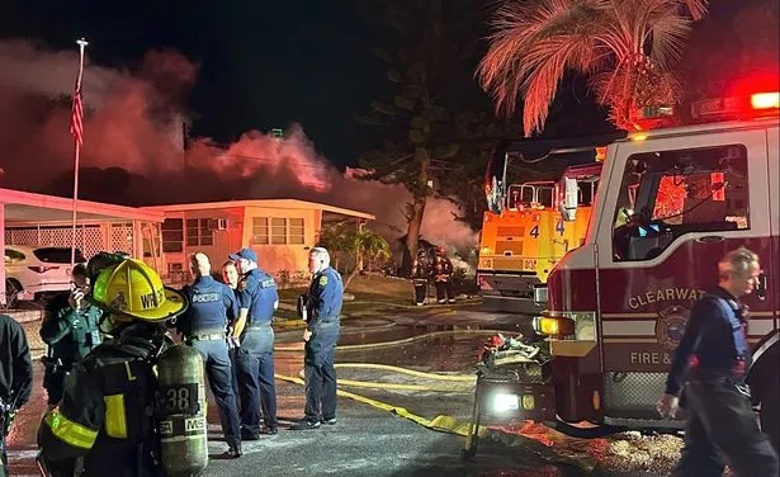 ക്ലിയർവാട്ടർ ഫയർ ആൻഡ് റെസ്ക്യൂ ഡിപ്പാർട്ട്മെൻ്റ് ഓൺലൈനിൽ പോസ്റ്റ് ചെയ്ത ചിത്രങ്ങളിൽ തകർന്ന വീട്ടിൽ നിന്ന് തീയും പുകയും ഉയരുന്നത് കാണിച്ചു.
