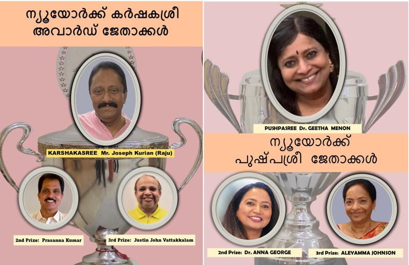 “കർഷകശ്രീ”-ക്കുള്ള ഒന്നാം സമ്മാനമായ എവർ റോളിങ്ങ് ട്രോഫി പ്രമുഖ വ്യവസായിയും എറിക് ഷൂസ്, ഹാനോവർ ബാങ്ക് എന്നിവയുടെ സാരഥിയുമായ വർക്കി എബ്രഹാമാണ് സ്പോൺസർ ചെയ്തിരിക്കുന്നത്. “പുഷ്പശ്രീ”-യുടെ ഒന്നാം സമ്മാനമായി എവർ റോളിങ്ങ് ട്രോഫി ഡാള്ളസിലുള്ള പ്രമുഖ വ്യവസായിയും യാക്കോബായ സഭാ കമ്മാൻഡറുമായ വർഗ്ഗീസ് ചാമത്തിലാണ് സ്പോൺസർ ചെയ്തിരിക്കുന്നത്. 2022-ലെ വിജയികൾക്ക് മുൻ മന്ത്രി മോൻസ് ജോസഫ്, എം.എൽ.എ. മാണി സി കാപ്പൻ എന്നിവർ ചേർന്നാണ് ട്രോഫികൾ സമ്മാനിച്ചത്. കൂടുതൽ വിവരങ്ങൾക്ക് : 917-459-7819.