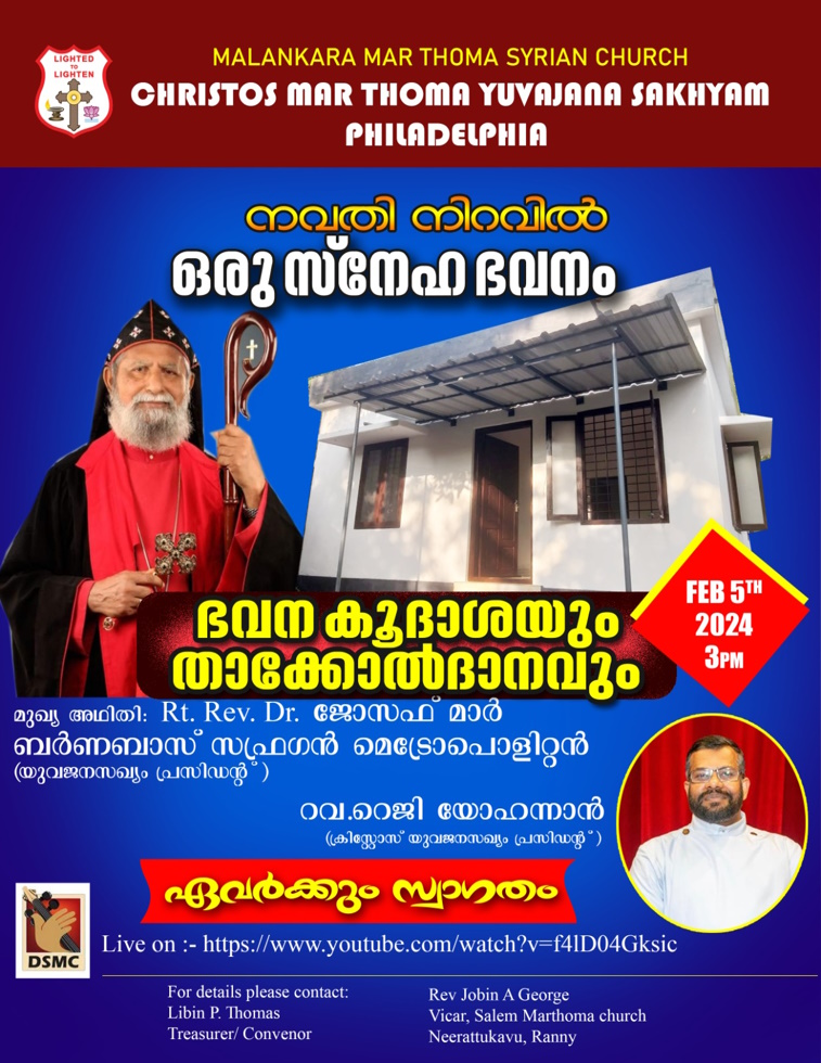 ഫിലഡൽഫിയ: മാർത്തോമാ യുവജന സഖ്യത്തിന്റെ നവതിആഘോഷങ്ങളുടെ ഭാഗമായി കേരളത്തിൽഭവനരഹിതരായ ഒരു കുടുംബത്തിന് ക്രിസ്തോസ് മാർത്തോമ യുവജനസഖ്യം ഒരു ഭവനം നിർമിച്ചുനൽകുന്നു. ഭവനത്തിന്റെ കൂദാശ കർമ്മം ഫെബ്രുവരി 5 നെ തിങ്കളാഴ്ച 3 മണിക്ക് മാർത്തോമാ യുവജന സഖ്യം പ്രസിഡന്റ്അഭിവന്ദ്യ ഡോക്ടർ ജോസഫ് മാർ ബർണബാസ് സഫ്രഗൻ മെത്രാപോലീത്ത തിരുമേനി നീർവഹിക്കുന്നതാണ്. തുടർന്ന് നടക്കുന്ന പൊതുസമ്മേളനത്തിലും തിരുമേനി അധ്യക്ഷത വഹിക്കും. സംസ്കാരിക രാഷ്ട്രീയ രംഗത്തെപ്രമുഖരായ ആളുകൾ പങ്കെടുത്ത് ആശംസകൾ അർപ്പിക്കുന്നതും ആണ്.