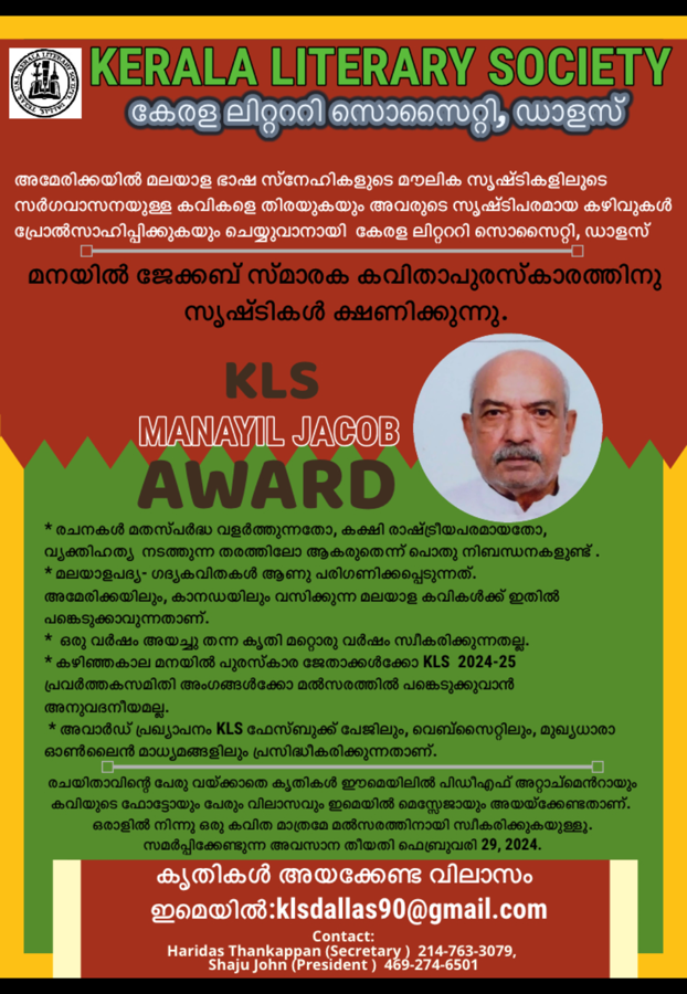 For more information : Shaju John (KLS President 2024-25) 469-274-6501, Haridas Thankappan (KLS Secretary 2024-25)