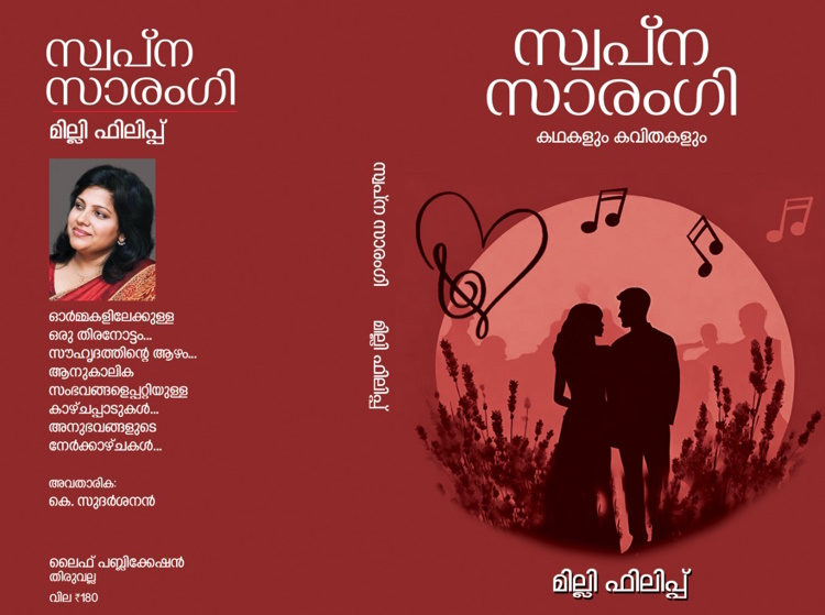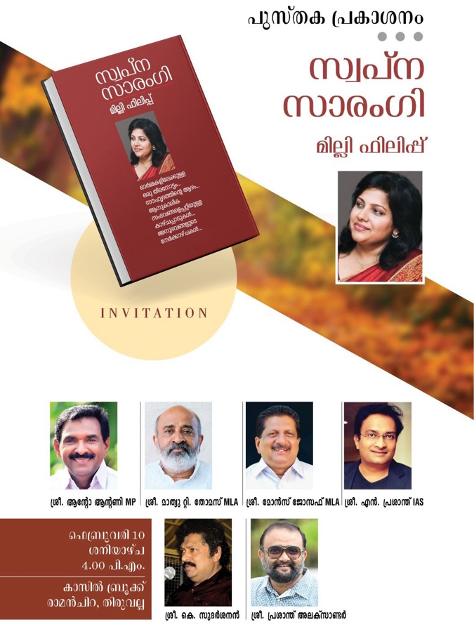 പ്രശസ്ത എഴുത്തുക്കാരി മില്ലി ഫിലിപ്പിന്റെ “സ്വപ്ന സാരംഗി” എന്ന പുസ്തകത്തിന്റെ പ്രകാശനം ഫെബ്രുവരി 10 ശനിയാഴ്ച വൈകിട്ട് നാലു മണിക്ക് തിരുവല്ലയിലുള്ള കാസ്റ്റിൽ ബ്രൂക്കിൽ വെച്ച് നടത്തപ്പെടുന്നു. ഈ അവസരത്തിൽ ആന്റോ ആന്റണി എം പി , മാത്യു റ്റി തോമസ് MLA, മോൻസ് ജോസഫ് MLA, എൻ . പ്രശാന്ത് IAS , സാഹിത്യകാരൻ കെ .സുദർശനൻ (മുൻ ഗവൺമെന്റ് സ്പെഷ്യൽ സെക്രട്ടറി) , പ്രശാന്ത് അലക്സാണ്ടർ എന്നിവർ പങ്കെടുക്കുന്നതാണ്.