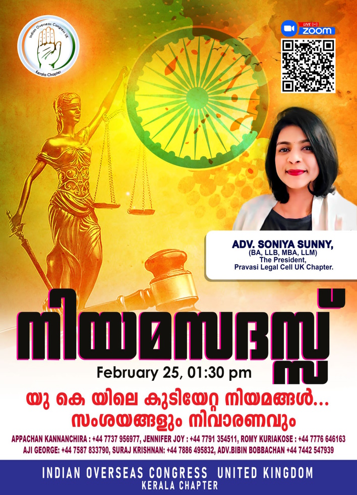 ഐഒസി (യു കെ) – കേരള ചാപ്റ്റർ നേതൃത്വം നൽകികൊണ്ട് ഫെബ്രുവരി 25, 1.30 – ന് സൂം (ZOOM) മുഖേന ഒരുക്കുന്ന ‘നിയമസദസ്സ്’ സെമിനാറിലേക്ക് ഏവരെയും ഹാർദ്ധമായി സ്വാഗതം ചെയ്യുന്നു.