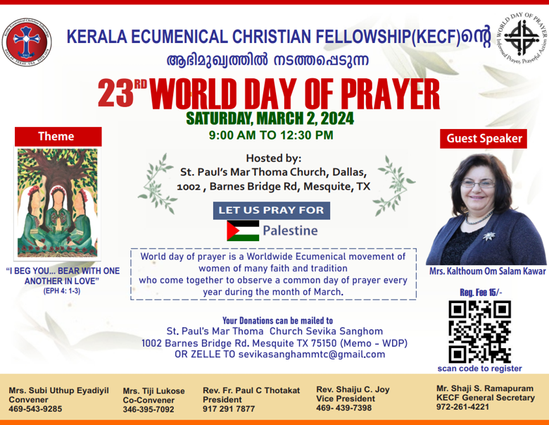 ഡാളസ്: കേരള എക്യൂമെനിക്കൽ ക്രിസ്ത്യൻ ഫെലോഷിപ്പിന്റെ നേതൃത്വത്തിൽ ഡാളസിൽ അഖില ലോക പ്രാർത്ഥനാ ദിനം മാർച്ച് 2 ശനിയാഴ്ച രാവിലെ 9 മണി മുതൽ 12.30 വരെ മെസ്ക്വിറ്റ് സെന്റ്. പോൾസ് മാർത്തോമ്മ ദേവാലയത്തിൽ (1002 Barnes Bridge Rd, Mesquite, Tx 75150) വെച്ച് നടത്തപ്പെടും.