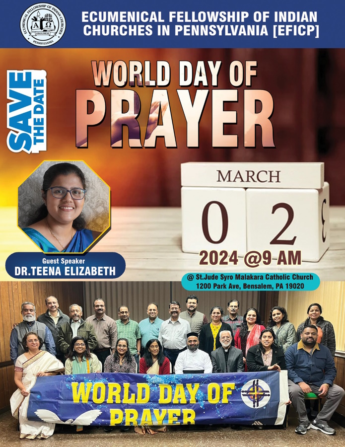 ഫിലഡൽഫിയ: വേൾഡ് ഡേ ഓഫ് പ്രയർ മാർച്ച് രണ്ടാം തീയതി ശനിയാഴ്ച രാവിലെ ഒമ്പതുമുതൽ സെൻജൂഡ് മലങ്കര കത്തോലിക്ക ദൈവാലയത്തിൽ( 1200 പാർക്ക് അവന്യൂ,ബെൻസലെം, പി,എ -19020) വച്ച്നടക്കുന്ന വേൾഡ് ഡേ ഓഫ് പ്രയറിന്റെ ഒരുക്കങ്ങൾ പൂർത്തിയായി. ഈ വർഷത്തെ ചിന്താവിഷയം എഫെസ്യർ4:1-7വരെ അടിസ്ഥാനപ്പെടുത്തിയാണ് രൂപപ്പെടുത്തിയിരിക്കുന്നത്. സമൂഹത്തിലെ അശരണരുംആലംബഹീനരുമായ ജനസമൂഹത്തിന്റെ ഉന്നമനത്തിനായിട്ടുള്ള നിരവധി പദ്ധതികള് ആസൂത്രണം ചെയ്ത്പ്രവര്ത്തിച്ചു വരുന്ന എക്യൂമെനിക്കല് ഫെലോഷിപ്പിന്റെ വഴിത്താരയിലെ നാഴിക കല്ലുകളിലൊന്നായ ലോക പ്രാര്ത്ഥനാദിനത്തിന്റെ ഈ വര്ഷത്തെ ചിന്താവിഷയം ഞാൻ നിങ്ങളെ പ്ര ബോധിപ്പിക്കുന്നത്.