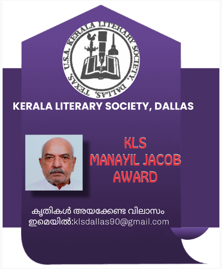 ഡാളസ് : അമേരിക്കയിൽ മലയാള ഭാഷ സ്നേഹികളുടെ മൗലിക സൃഷ്ടികളിലൂടെ സർഗവാസനയുള്ള കവികളെ പ്രോൽസാഹിപ്പിക്കുവാനായി ഡാലസ്സിലെ മലയാളി എഴുത്തുകാരുടെയും സാഹിത്യാസ്വാദകരുടെയും സംഘടനയായ കേരള ലിറ്റററി സൊസൈറ്റി (കെ എൽ എസ്സ്) ഡാളസിന്റെ പ്രഥമ പ്രസിഡന്റും പ്രവാസി മലയാളകവിയുമായ ശ്രീ.മനയിൽ ജേക്കബിന്റെ സ്മരണാർത്ഥം വാർഷിക അവാർഡ് നൽകപ്പെടുന്ന കവിതാ പുരസ്കാരത്തിനു കവിതകൾ അയയ്ക്കാനുള്ള തീയതി മാർച്ച് 10 വരെ നീട്ടിയിരിക്കുന്നു.