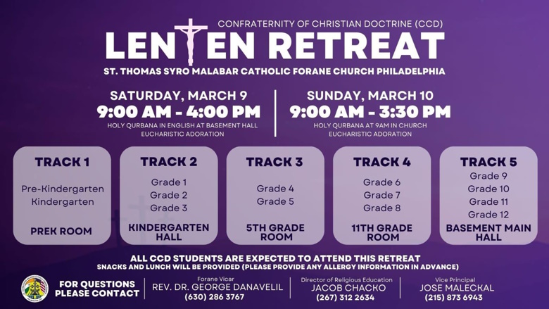 മുതിര്ന്നവര്ക്കു മലയാളത്തിലുള്ള മൂന്നുദിവസത്തെ ധ്യാനം ഫാ. സന്തോഷ് നയിക്കും. മാര്ച്ച് 8 വെള്ളിയാഴ്ച്ച ആറുമണിക്ക് വി. കുര്ബാനയോടുകൂടി ധ്യാനം ആരംഭിക്കും. വചനസന്ദേശം, കുരിശിന്റെ വഴി എന്നിവയാണു വെള്ളിയാഴ്ച്ചയിലെ പരിപാടികള്. ഒന്പതു മണിക്ക് സമാപനം.
