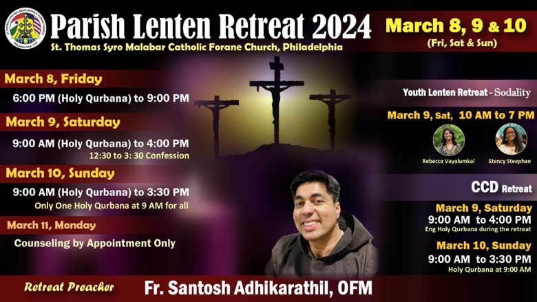 ഫിലാഡല്ഫിയ: സെന്റ് തോമസ് സീറോ മലബാര് ഫൊറോനാപള്ളിയിലെ നോമ്പുകാലധ്യാനം മാര്ച്ച് 8 വെള്ളിയാഴ്ച്ച വൈകുന്നേരം ആറുമണിക്ക് ആരംഭിച്ച് ഞായറാഴ്ച്ച മൂന്നരക്ക് അവസാനിക്കും. ജനപ്രിയ ടെലിവിഷന് ചാനലുകളിലൂടെയുള്ള വചനപ്രഘോഷണത്തിലൂടെ അനേകായിരങ്ങളൂടെ മനസില് ഇടം നേടിയിട്ടുള്ള കപ്പുച്ചിന് സഭാംഗമായ റവ. ഫാ. സന്തോഷ് അധികാരത്തില് ഛഎങ ഇമു ആണു ധ്യാനം നയിക്കുന്നത്. മുതിര്ന്നവര്ക്കും, യുവാക്കള്ക്കും, മതബോധനസ്കൂള് കുട്ടികള്ക്കും സമാന്തരമായി വ്യത്യസ്ത ട്രാക്കുകളിലായിട്ടാണു ധ്യാനം ക്രമീകരിച്ചിരിക്കുന്നത്.