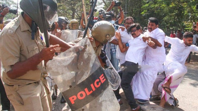 ഇടുക്കി ജില്ലയിലെ കാഞ്ഞിരവേലിയിൽ ആന ചവിട്ടിക്കൊന്ന സ്ത്രീയുടെ മൃതദേഹവുമായി രണ്ട് മണിക്കൂറോളം കോൺഗ്രസ് പ്രവർത്തകർ പ്രതിഷേധിച്ചപ്പോൾ മൃതദേഹം വീണ്ടെടുക്കാൻ പോലീസ് ലാത്തിച്ചാര്ജ് നടത്തി.