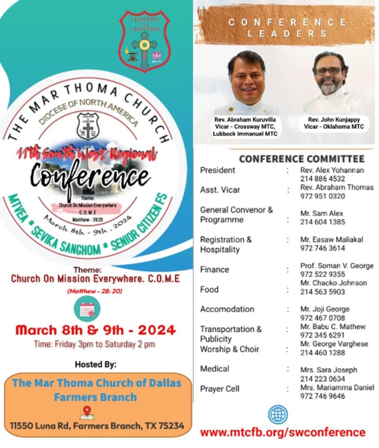 ഇന്ന് (വെള്ളി) വൈകിട്ട് 3 മണിക്ക് ഡാളസ് ഫാർമേഴ്സ് ബ്രാഞ്ച് മാര്ത്തോമ്മാ ദേവാലയത്തില് (11550 Luna Rd, Farmers Branch, Tx 75234) വെച്ച് തുടക്കം കുറിക്കുന്ന സൗത്ത് വെസ്റ്റ് റീജിയണല് മാര്ത്തോമ്മാ കോണ്ഫ്രറന്സ് നാളെ (ശനി) ഉച്ചക്ക് 2 മണിക്ക് സമാപിക്കും.