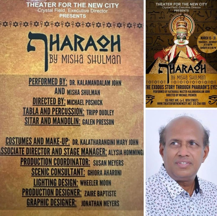 ന്യൂയോർക്ക്: മലയാളികളുടെ പൈതൃക കലാരൂപമായ കഥകളിക്ക് ന്യൂയോർക്കിലും അംഗീകാരം. മലയാളികൾക്ക് അഭിമാനിക്കാവുന്ന സുവർണ്ണ നിമിഷങ്ങളാണ് മാർച്ച് 15 മുതൽ 31 വരെയുള്ള രണ്ടാഴ്ചക്കാലം പത്ത് കഥകളി കാലാവതരണത്തിലൂടെ ന്യൂയോർക്കിലെ ബ്രോഡ് വേ ഷോയ്ക്ക് തത്തുല്യമായി തിയേറ്റർ ഫോർ ദി ന്യൂ സിറ്റി (Theater For The New City, 155 First Avenue, New York, NY 10003) തിയേറ്ററിൽ അരങ്ങേറുവാൻ പോകുന്നത്. ലൈവ് പെർഫോമൻസ് ആർട്ട് ഗണത്തിൽപ്പെടുത്തി കഥകളി എന്ന കലാരൂപം ബൈബിളിൽ പ്രതിപാദിക്കുന്ന മോശയുടെ കാലത്ത് ജീവിച്ചിരുന്ന ഈജിപ്ഷ്യൻ രാജാവ് ഫറവോൻറെ ജീവിതവുമായി കോർത്തിണക്കി അവതരിപ്പിക്കുന്ന മനോഹരമായ പ്രകടനമാണ് ഡോ. കലാമണ്ഡലം ജോൺ കാഴ്ചവെക്കുന്നത്.