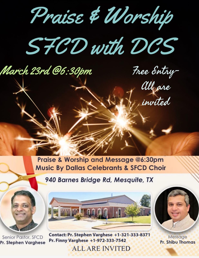 കൂടുതൽ വിവരങ്ങൾക്കു: പാസ്റ്റർ സ്റ്റീഫൻ വർഗീസ് 1 321 333 8371, പാസ്റ്റർ ഫിന്നി വർഗീസ് 1 972 333 7542