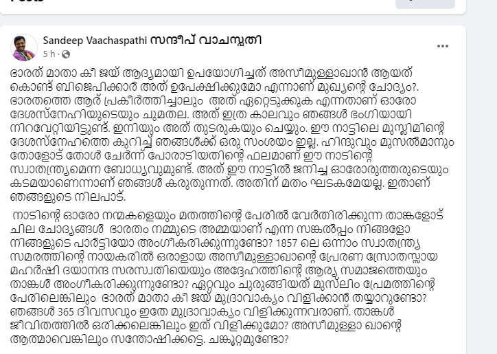 ‘ഭാരത് മാതാ കീ ജയ്’ എന്ന മുദ്രാവാക്യം വിളിച്ചത് മുസ്ലീമായ അസിമുള്ള ഖാനാണ് എന്നാണ് സന്ദീപ് വാചസ്പതി തൻ്റെ പോസ്റ്റിൽ പരാമർശിച്ചത്. മുദ്രാവാക്യം ഉണ്ടാക്കിയത് മുസ്ലീം ആണെന്ന് പറഞ്ഞ് ബിജെപി അത് ഉപേക്ഷിക്കുമോ?’ ഭാരതത്തെ സ്തുതിക്കുകയും ബഹുമാനിക്കുകയും ചെയ്യേണ്ടത് ഓരോ രാജ്യസ്നേഹിയുടെയും കടമയാണെന്നും സന്ദീപ് വാചസ്പതി കൂട്ടിച്ചേർത്തു. രാജ്യത്തെ ആരു പുകഴ്ത്തിയാലും ബിജെപി അവരെ ബഹുമാനിക്കുകയും പരിഗണിക്കുകയും ചെയ്യുമെന്നും അത് തുടരുമെന്നും അദ്ദേഹം സൂചിപ്പിച്ചു.