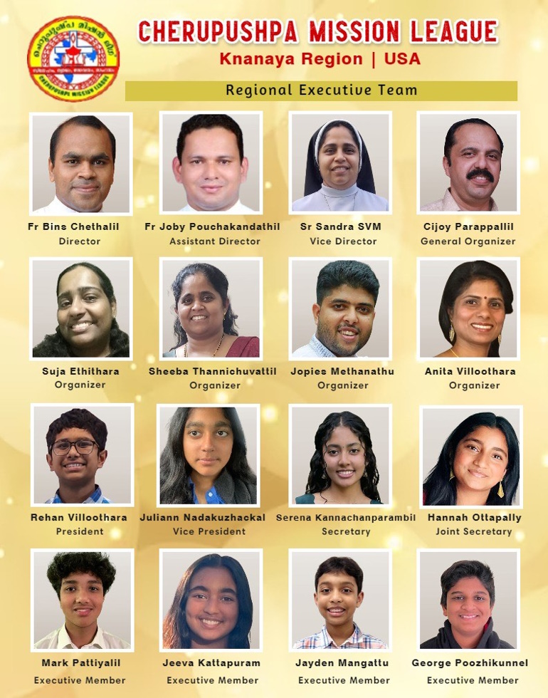 ചിക്കാഗോ: കത്തോലിക്കാ സഭയിലെ കുഞ്ഞുമിഷനറിമാരുടെ സംഘടനയായ ചെറുപുഷ്പ മിഷൻ ലീഗിന്റെ അമേരിക്കയിലെ ക്നാനായ റീജിയണൽ ഭാരവാഹികളെ തിരഞ്ഞെടുത്തു. രേഹൻ വില്ലൂത്തറ ലോസ് ആഞ്ചലസ് (പ്രസിഡന്റ്), ജൂലിയാൻ നടക്കുഴക്കൽ സാൻ ഹൊസെ (വൈസ് പ്രസിഡന്റ്), സെറീന കണ്ണച്ചാംപറമ്പിൽ ഡിട്രോയിറ്റ് (സെക്രട്ടറി), ഹാനാ ഓട്ടപ്പള്ളി ചിക്കാഗോ (ജോയിൻറ് സെക്രട്ടറി) എന്നിവരാണ് പുതിയ ഭാരവാഹികൾ. മാർക് പാറ്റിയാലിൽ ന്യൂയോർക്ക്, ജീവാ കട്ടപ്പുറം സാൻ അന്തോണിയോ, ജയ്ഡൻ മങ്ങാട്ട് ഹൂസ്റ്റൺ, ജോർജ് പൂഴിക്കുന്നേൽ റ്റാമ്പാ എന്നിവരെ എക്സിക്യൂട്ടീവ് അംഗങ്ങളായും തിരഞ്ഞെടുത്തു. ക്നാനായ റീജിയണിലെ അഞ്ചു ഫൊറോനകളിലെയും ഭാരവാഹികളുടെ മീറ്റിങ്ങിലാണ് റീജിയണൽ ഭാരവാഹികളെ തിരഞ്ഞെടുത്തത്. ഫാ. ബിൻസ് ചേത്തലിൽ (ഡയറക്ടർ), ഫാ. ജോബി പൂച്ചുകാട്ടിൽ (അസിറ്റന്റ് ഡയറക്ടർ), സിസ്റ്റർ സാന്ദ്രാ എസ്.വി.എം (ജോയിന്റ് ഡയറക്ടർ), സിജോയ് പറപ്പള്ളിൽ (ജനറൽ ഓർഗനൈസർ), സുജ ഇത്തിത്തറ, ഷീബാ താന്നിച്ചുവട്ടിൽ, ജോഫീസ് മെത്താനത്ത്, അനിതാ വില്ലൂത്തറ (ഓർഗനൈസർമാർ) എന്നിവരാണ് മറ്റു റീജിയണൽ എക്സിക്യൂട്ടീവ് അംഗങ്ങൾ.