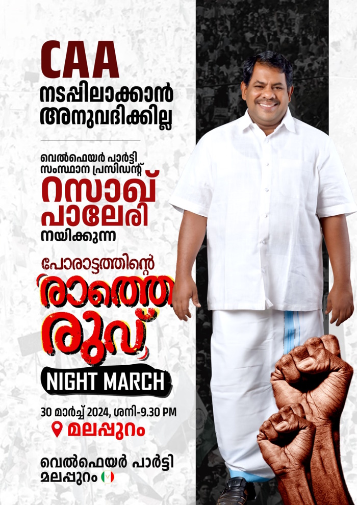 റസാഖ് പാലേരി നയിക്കുന്ന പോരാട്ടത്തിന്റെ *രാത്തെരുവ്* 30 മാർച്ച് 2024 ശനിയാഴ്ച മലപ്പുറത്ത് നടക്കും. മലപ്പുറം കിഴക്കെതലയിൽ നിന്ന് രാത്രി 9.30ന് ആരംഭിക്കുന്ന നൈറ്റ് മാർച്ച് കുന്നുമ്മലിൽ സമാപിക്കും.