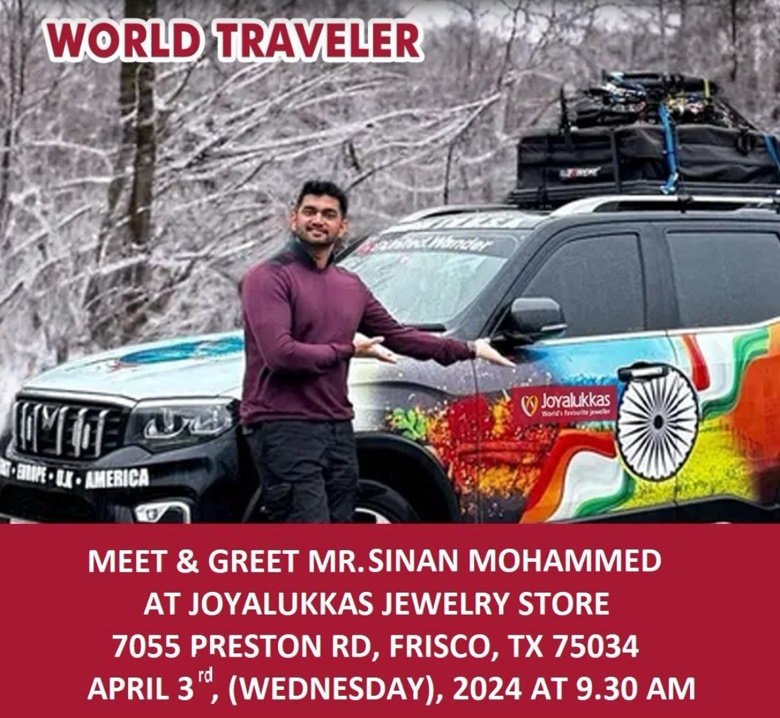 കര്ണ്ണാടകയിലെ മംഗലാപുരം സ്വദേശിയും ആർക്കിടെക്ട് ബിരുദ ധാരിയുമായ മുഹമ്മദ് സിനാന് 70-ലധികം രാജ്യങ്ങള് സഞ്ചരിച്ചാണ് അമേരിക്കയിലെത്തിയത്. ന്യൂയോര്ക്കും ന്യൂജേഴ്സിയും സന്ദര്ശിച്ച സിനാന് ന്യൂജേഴ്സിയിലെ എഡിസണിലുള്ള ജോയ് ആലുക്കാസ് ജ്വല്ലറി സ്റ്റോറില് സ്വീകരണം സംഘടിപ്പിച്ചിരുന്നു. ഷിക്കാഗോ, അറ്റ്ലാന്റ, ഫ്ളോറിഡ കീ വെസ്റ്റ്, ഡാളസ്, ഹൂസ്റ്റണ്, കാലിഫോര്ണിയ എന്നീ സംസ്ഥാനങ്ങളിലൂടെ യാത്ര ചെയ്ത് പിന്നീട്ഓസ്ട്രേലിയ, മലേഷ്യ, തായ്ലൻഡ്, കംബോഡിയ, വിയറ്റ്നാം, ലാവോസ്, മ്യാൻമാർ, നേപ്പാൾ വഴി ഇന്ത്യയിൽ എത്താനാണ് സിനാന്റെ പദ്ധതി.