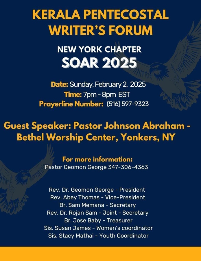 ന്യൂയോർക്ക് : പുതിയ എഴുത്തുകാരുടെ സർഗ്ഗവാസനകളെ പ്രോത്സാഹിപ്പിക്കുന്നതിന്റെ ഭാഗമായി നോർത്ത് അമേരിക്കയിലെ എല്ലാ മലയാളി പെന്തക്കോസ്ത് പ്രാദേശിക സഭകളെയും ഉൾപ്പെടുത്തി ഉപന്യാസം, ചെറുകഥ, കവിത, ലേഖനങ്ങൾ, കാർട്ടൂൺ ചിത്രങ്ങൾ തുടങ്ങി സത്യവേദപുസ്തക വിഷയങ്ങളെ ആസ്പദമാക്കിയിട്ടുള്ള ക്രൈസ്തവ സാഹിത്യ രചനകൾ രചയിതാക്കളിൽ നിന്നും ക്ഷണിക്കുന്നു.