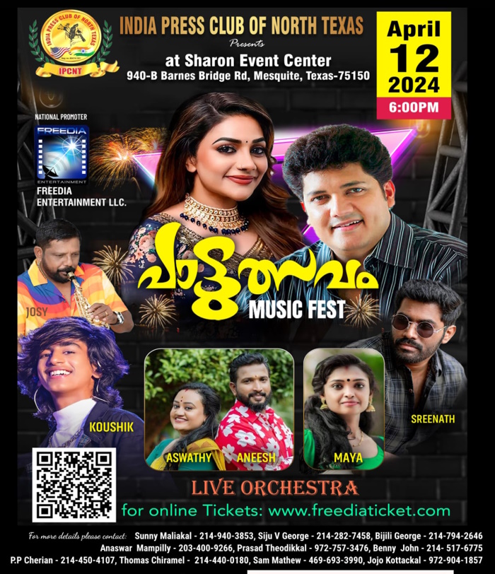 ഡാളസ്: ഇന്ത്യ പ്രസ്ക്ലബ് ഓഫ് നോർത്ത് ടെക്സാസ് പ്രവർത്തനോദ്ഘാടനാത്തോടനുബന്ധിച്ചു സംഘടിപ്പിക്കുന്ന പാട്ടുത്സവം ഏപ്രില് 12 നു വെള്ളിയാഴ്ച ഏഴു മണിക്ക് ഷാരോൺ ഇവന്റ് ഹാളിൽ അരങ്ങേറും (ബർണസ് ബ്രിഡ്ജ് റോഡ്, മെസ്ക്വിറ്റ് ടെക്സസ്). സിജു വി ജോർജാണ് പ്രോഗ്രാം കോർഡിനേറ്റർ. പ്രവേശനം പാസ്സുമൂലം നിയന്ത്രിക്കുമെന്നും അദ്ദേഹം അറിയിച്ചു