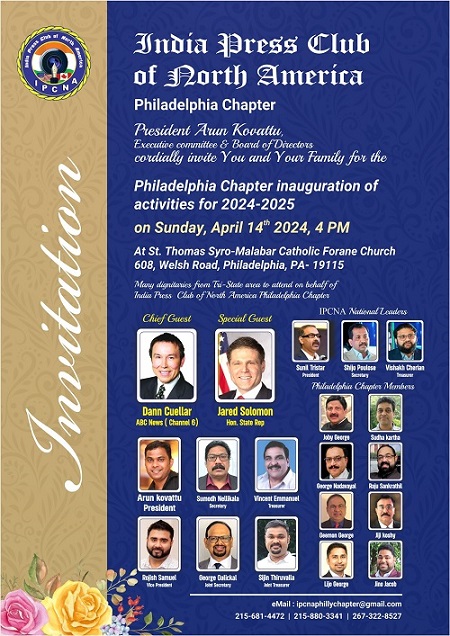 ഫിലഡൽഫിയ: ഇന്ത്യാ പ്രസ് ക്ലബ്ബ് ഓഫ് നോർത്ത് അമേരിക്ക (ഐപിസിഎന്എ) ഫിലഡൽഫിയ ചാപ്റ്ററിന്റെ 2024-25 വര്ഷത്തെ പ്രവര്ത്തനോദ്ഘാടന വേദിയില് ഫൊക്കാന-ഫോമ സ്ഥാനാര്ത്ഥികളുടെ സംവാദവും നടക്കും. ഏപ്രിൽ 14 ഞായറാഴ്ച വൈകീട്ട് 4 മണിക്ക് സെൻ്റ് തോമസ് സീറോ മലബാർ മിനി ഓഡിറ്റോറിയത്തിൽ (608 Welsh Rd, Philadelphia, PA 19115) വെച്ചാണ് ഉദ്ഘാടന സമ്മേളനം.