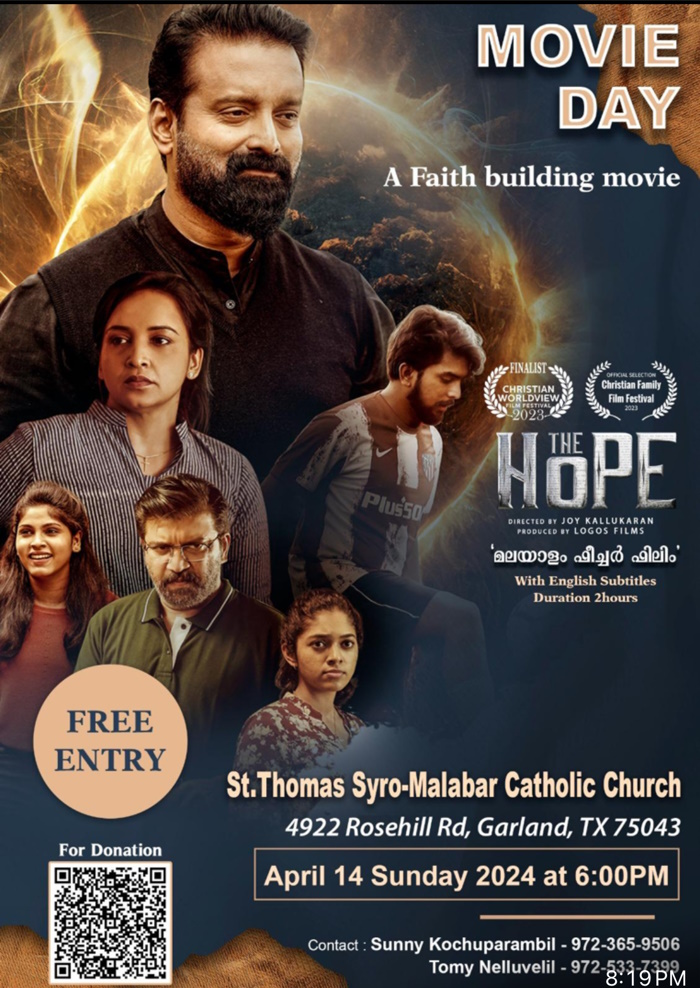 ഗാർലാൻഡ് (ഡാളസ് ):ഗാർലാൻഡ് സെന്റ് തോമസ് സീറോ മലബാർ ചർച്ചിൽ നിറഞ്ഞ സദസ്സിൽ :” ദി ഹോപ്പ് എന്ന മലയാളം ഫീച്ചർ ഫിലിം സൗജന്യമായി പ്രദർശിപ്പിച്ചു. ക്രസ്തീയ വിശ്വാസത്തിനു ഊന്നൽ നൽകി നിർമിച്ച ഈ ചിത്രം നിർമിച്ചിരിക്കുന്നത് ലോഗോ ഫിലിംസ് ബാനറിൽ ജോയ് കല്ലൂക്കാരനാണ് .രണ്ടു മണിക്കൂർ നീണ്ടു നിൽക്കുന്ന ചിത്രം കാണികളെ ചിന്തിപ്പിക്കുന്നതിനും, വിശ്വാസത്തിൽ ഉറപ്പിക്കുന്നതിനും മതിയായ ചേരുവകൾ ചേർത്താണ് നിർമിച്ചിരിക്കുന്നത്